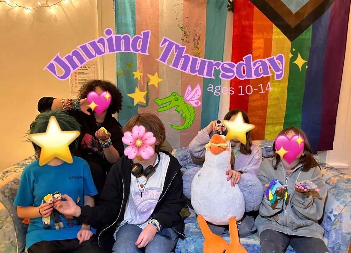 Unwind Thursday is a recurring weekly community support space for Queer and Trans youth ages 10-14 that takes place every Wednesday 6PM-8PM at QE’s community center, The Nest.